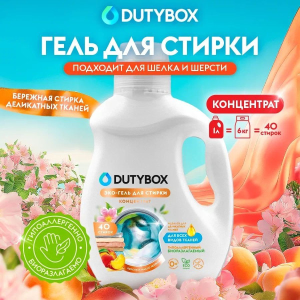 Гель для стирки из линейки DutyBox “Персик и масло жожоба”, универсальный (40 стирок) представляет собой экологичное и экономичное решение, которое обеспечивает идеальную чистоту и свежесть вашего белья. Подходит для стирки цветного, белого и черного белья из натуральных, синтетических и смешанных тканей. Средство является гипоаллергенным и подходит детского белья 0+ и одежды людей с чувствительной кожей. С гелем для стирки серии DutyBox Вы можете навсегда забыть о проблемах с пятнами. Активные компоненты входящие в состав геля предотвращают окрашивание вещей и препятствуют возникновению катышек. Не содержит ароматизаторы, красители, фосфаты, фосфонаты, акрилаты, агрессивные ПАВ, SLS, ЭДТА. Объем: 1 литр.