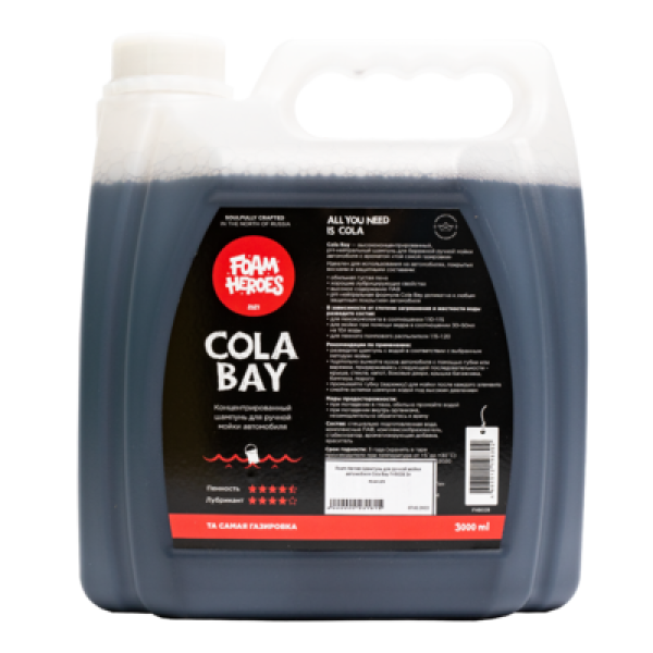 Cola Bay - высококонцентрированный Рh-нейтральный шампунь для бережной ручной мойки автомобиля с ароматом “той самой газировки”. Шампунь отлично подходит для использования на автомобилях, покрытых восками и защитными составами. Продукт создает обильную густую пену, имеет образцовые лубрицирущие свойства. Высокое содержание ПАВ и Рh-нейтральная формула деликатна к любым типам поверхностей.