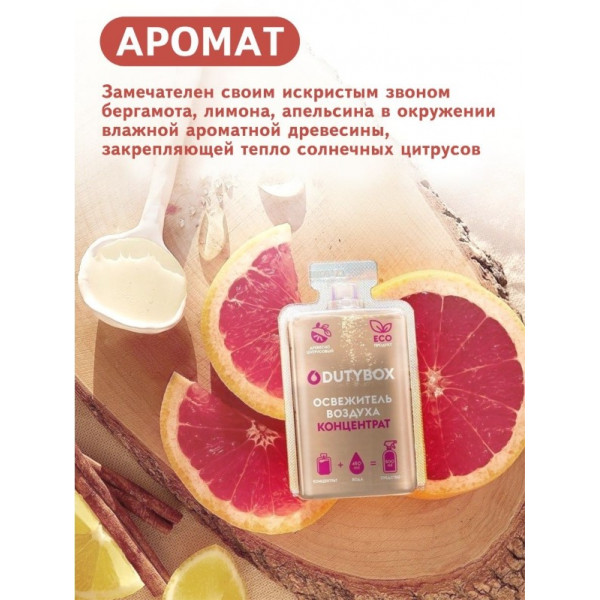 Спрей-ароматизатор воздуха из линейки DutyBox “Древесно-цитрусовый” представляет собой концентрат освежителя воздуха для дома и автомобиля. Эффективно устраняет неприятные запахи и освежает воздух, надолго сохраняет ощущение свежести и чистоты в Вашем доме (в ванной комнате, кухне, в шкафу для белья и обуви). Средство нейтрализует запахи животных, табака и сигарет, а также быстро и экологично убирает неприятные запахи в туалете, ванной и кухне, как самый лучший парфюм. Безопасен для людей, животных (собак, кошек) и окружающей среды. Объем: 50 мл.