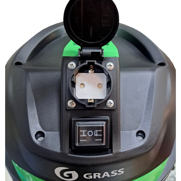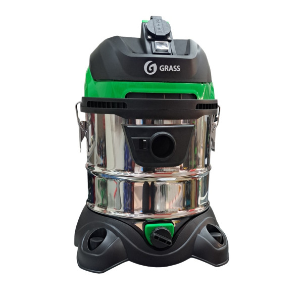 Профессиональный компактный пылесос для сухой и влажной уборки с баком из нержавеющей стали объемом 20 литров. Имеет встроенную розетку 220В для подключения электроинструмента.