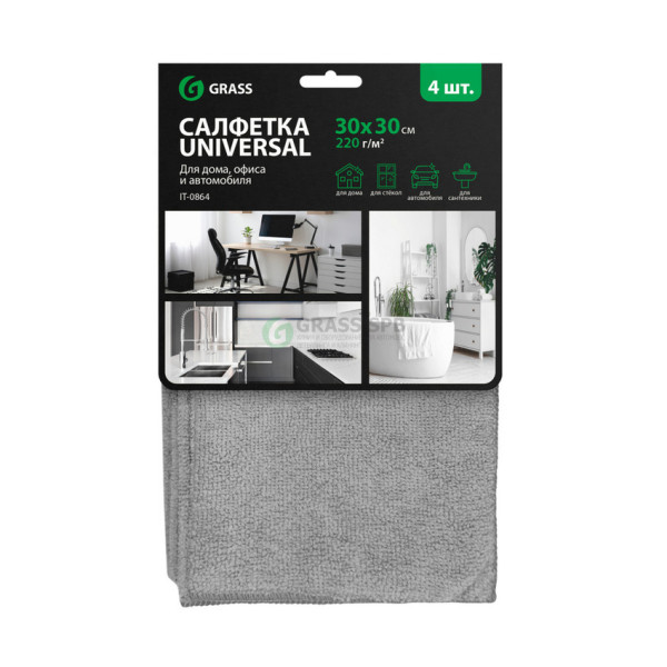 Универсальная салфетка из микрофибры 30х30 см, плотность 220 г/м?, серая, 4 шт. С картонным хедером для подвеса. Применяется как протирочный материал, подходит для сухой и влажной уборки. Используется для удаления загрязнений и жирных пятен с сантехники, кухонного оборудования, посуды, кафеля, бытовой техники, а также для финишной полировки предварительно очищенных поверхностей. После использования салфетку из микрофибры постирать и дать высохнуть естественным путем. Состав: 20% полиамид, 80% полиэстер.