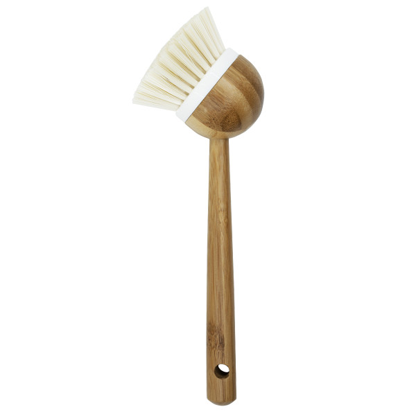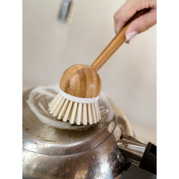 Эко-щетка для мытья посуды и овощей, круглая. Удобная ручка из бамбука не впитывает влагу, не гниет, не создает неприятного запаха. ПЭТ-щетина щетки очень деликатна, но в то же время эффективна при очистке засохших и пригорелых загрязнений. Данная модель станет надежным помощником на Вашей кухне: компактная и чрезвычайно удобная в применении щетка предназначена для мытья посуды, овощей, столовых приборов, кухонной утвари, а также подходит для чистки поверхности плит, раковин, ванн и кафеля. Настоящие хозяйки по достоинству оценят качество и практичность этой модели: простота, надежность и внимание к мелочам.