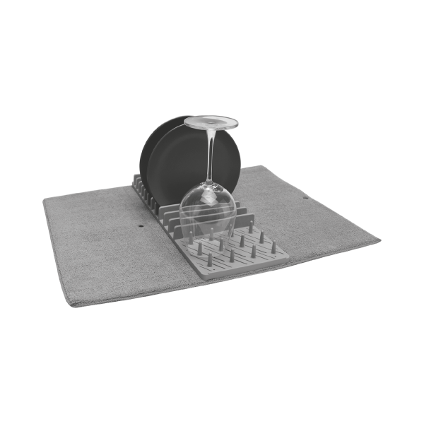 Сушилка с ковриком от Dutybox поможет компактно уместить большое количество посуды и сохранит поверхность стола сухой и чистой. Ворсистый коврик для посуды и столовых приборов + пластиковая сушилка с 6 делениями для тарелок. Съемный пластиковый держатель может быть закреплён в любой удобной для Вас позиции: посередине или с краю коврика, чтобы освободить место для размещения крупной посуды. Кроме того, он легко снимается для мытья. Коврик складывается в три раза и закрепляется металлической клепкой для компактного хранения. Нижняя часть коврика состоит из 100 % полиэстера, благодаря которому влага быстро впитывается. Такой аксессуар сможет стать удобным и эстетичным дополнением вашей кухни.